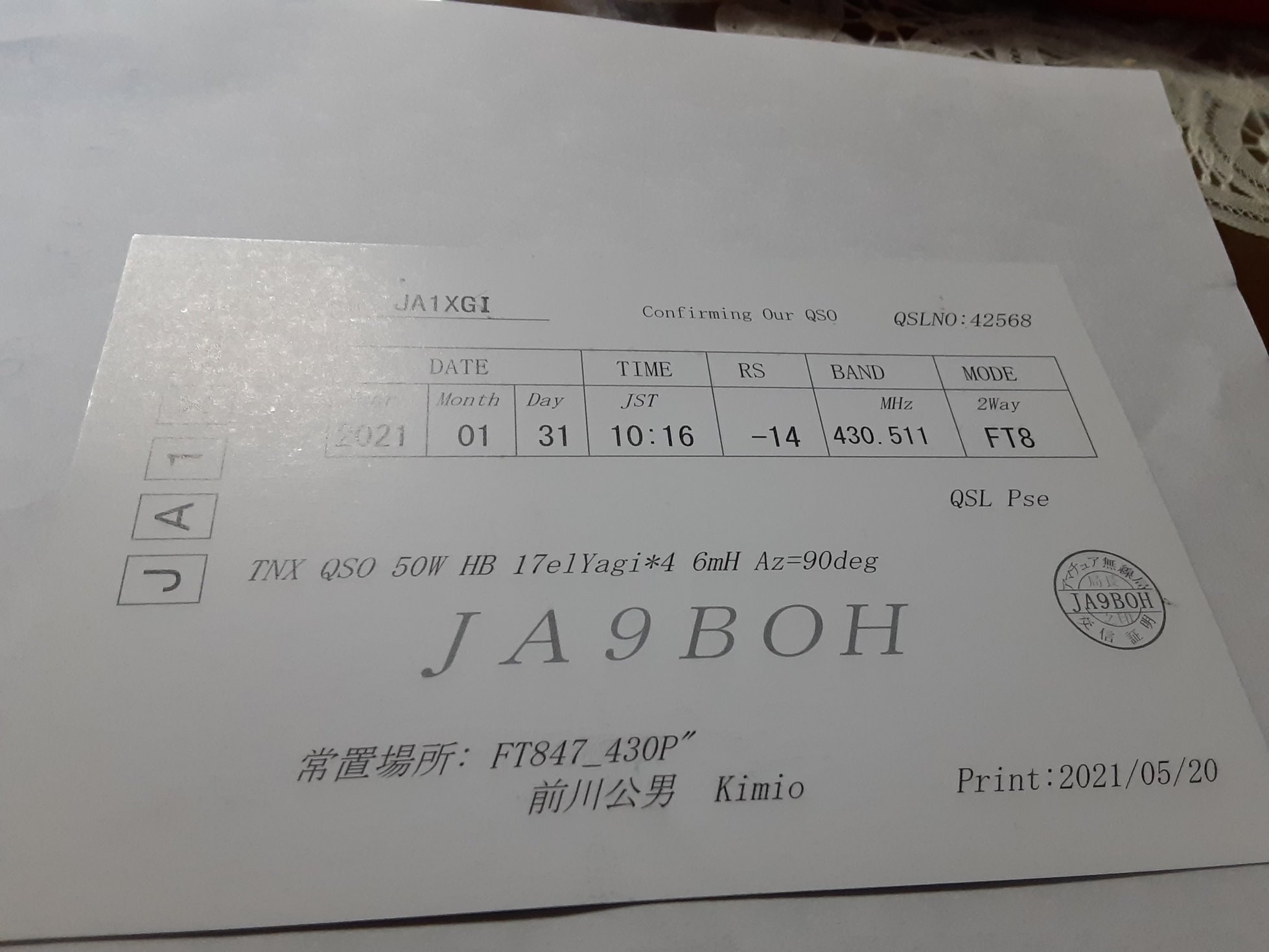 430Mhz FT8でファーストJA9でしたが、この日の数日後SKになってしまいました。