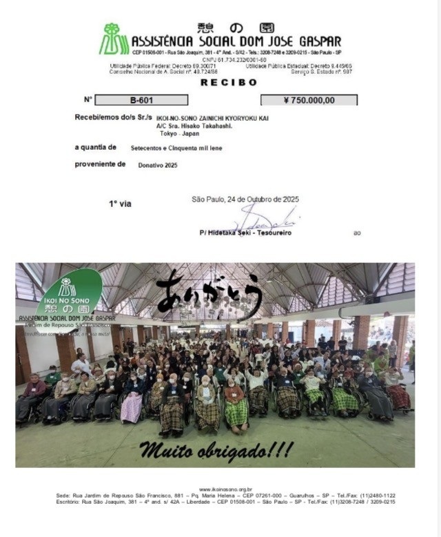 Nesta ocasião, gostaríamos de informar que recebemos oficialmente da Kyusaikai a carta de agradecimento e o recibo referentes à doação de 750.000 ienes entregue ao presidente Honda.