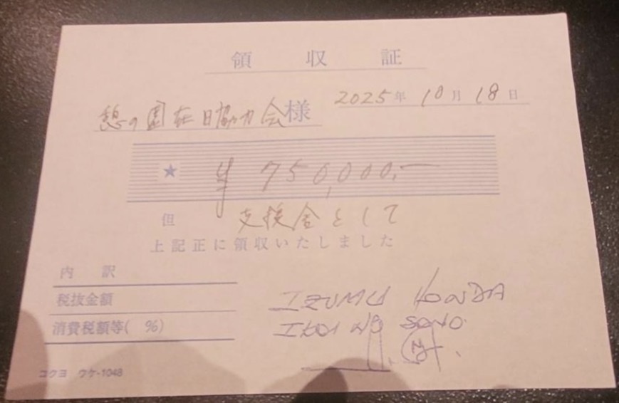 このたび、その際にお渡しした 75万円の寄付金 について、救済会から正式な お礼状と領収書 が届きましたので、あらためてご報告申し上げます。