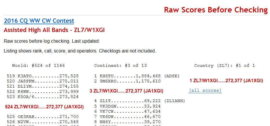 2016 CQ WW CW CONTEST 暫定スコアー |