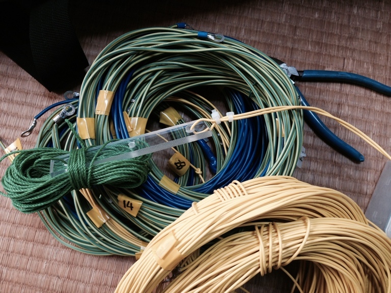 160m用のAki Special用のエレメント+ラジアル(黄色)も。調整用のエレメント(電線)も一緒にスキーケースに梱包。