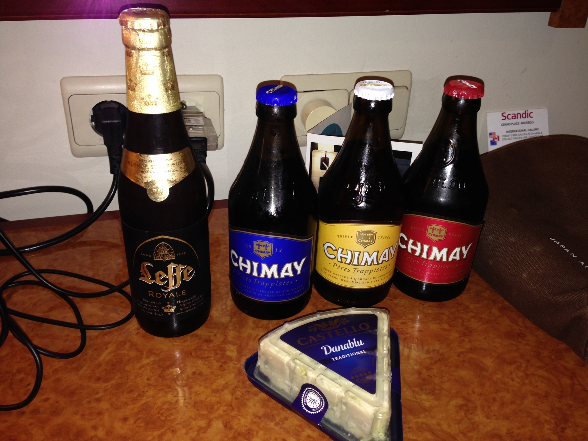 定番のChimay 3本、Leffe、青カビチーズで6€程度。