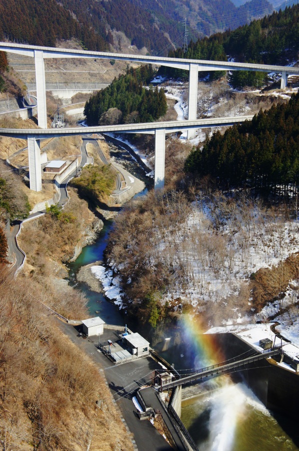 構築されて居ます。ダム直下の放水幕に丁度「虹」が