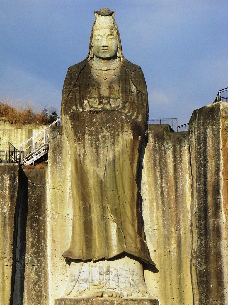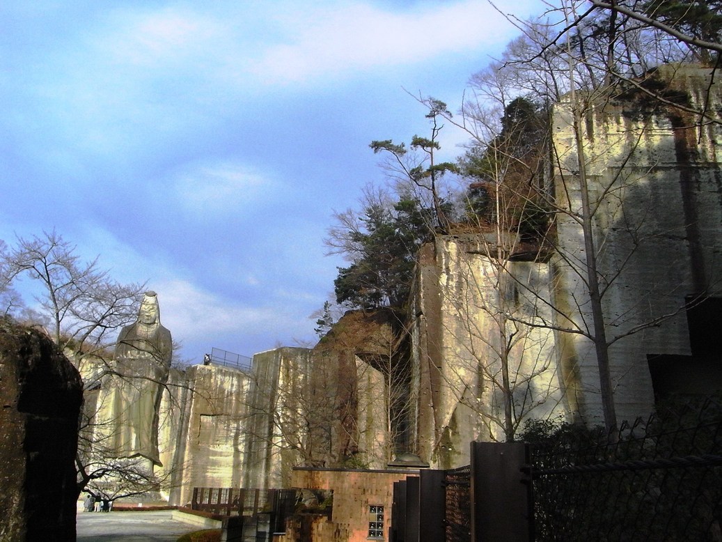 宇都宮と言えば餃子と大谷石なので石の里「大谷観音」に行ってきました。大谷石とは、今から約2000万年前に火山活動によって生まれた緑色凝灰岩。軽石を含み、ざらざらして緑色の絣模様が入っている特徴。斑点状にある、柔らかい褐色の部分は「みそ」という、柔らかく加工がしやすい。耐久性にもすぐれているので、いろいろなものに使用されています。この大谷石を有名にしたのは、大正時代にアメリカ人の設計士が旧帝国ホテルの建築材に使用したから。関東大地震の時も被害を受けることもなかったので、その優秀さが認められました。
