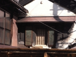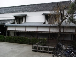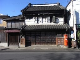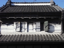 田口家住宅は初代は市朗左衛門という。屋号は「百足屋」といい、糸、組紐問屋を営んでいた。大きな蔵造りと違い、袖蔵を持っていない。店蔵は比較的規模が小さいが均整がとれています。二階の観音扉に特徴があります。他の蔵と違い薄い銅板を貼る(右側の写真)ことによって耐火性の向上をはかっています。母屋の南側に突出部に台所があり、座敷南側が広い庭になつています。