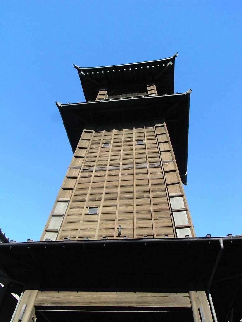 現在の鐘楼は、明治26年(1893年)の大火翌年に再建されたものです。 鐘の下で団子屋(左と真中)「田中屋」を営む田中氏は「昔は、人が登って鐘をついていて、『鐘つき堂』って呼ばれていた」と言う。今は機械が自動で鐘を打つが、戦前は鐘つき番がいて、時報のほか、火事の発生も鐘で知らせていた。田中さんの曽祖父源五郎さも明治から大正にかけて鐘つき番をしていた。仏壇にしまってある源五郎さんの懐中時計を見せてもらいました。100年以上たった今でもねじを巻けばコツコツ時を刻む。田中さんは「曽祖父はこの時計を見ながら、正確に鐘をついていたんでしょうね」と目を細めた。