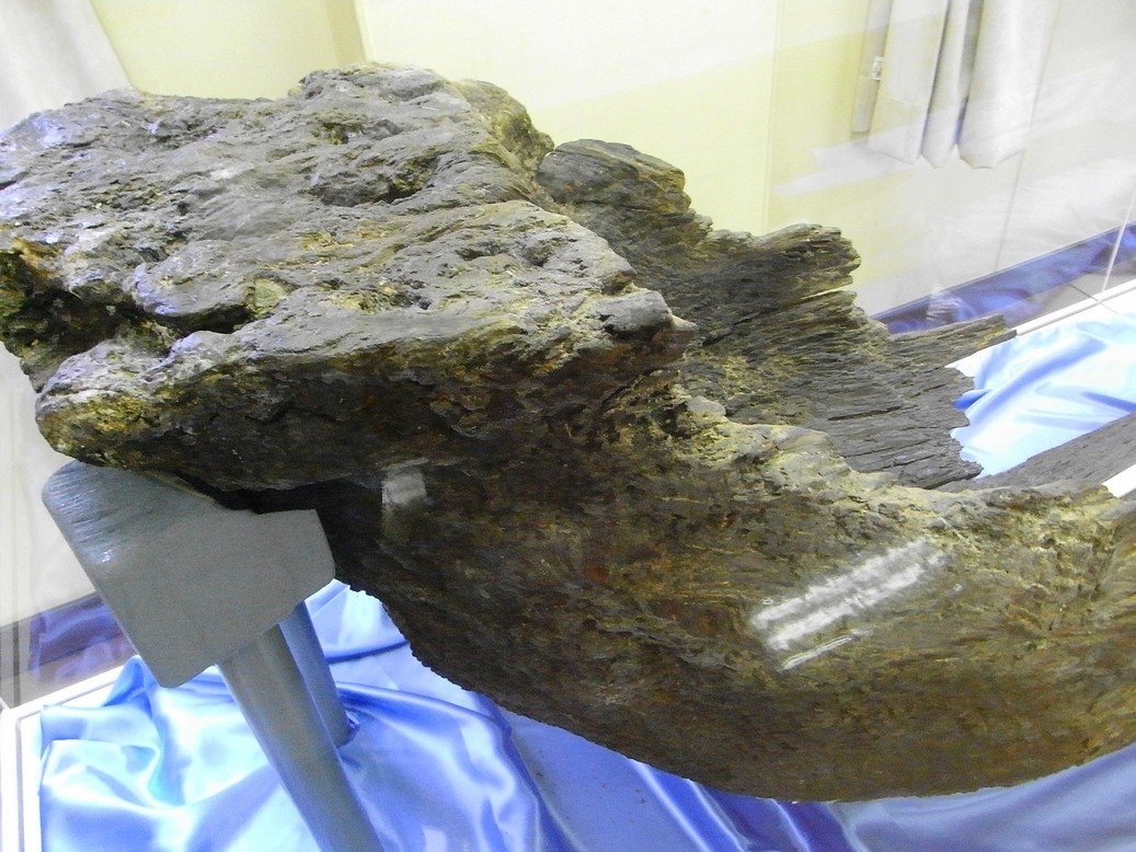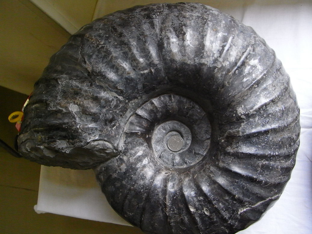 写真は縄文前期として貴重な丸木船(右)と北海道産の寄贈された巨大なアンモナイト。この丸木船は保存するためにポリエチレングリコール処理してあります。