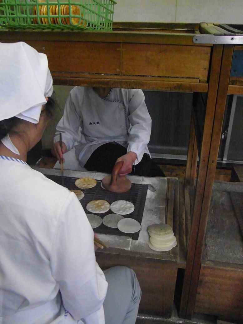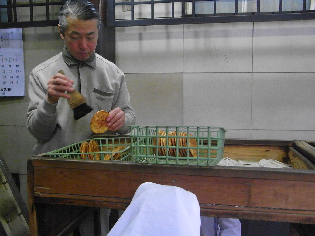 左の写真は焼きの過程でホイロで生地を暖めた後、焼き網にせんべいを載せ、箸で機敏に反転させます。焼き始めると気泡ができますので押瓦で平らに押します。仕上げは焼きあがったせんべいに醤油を一枚一枚刷毛で塗ります(真ん中の写真)。風味を出すために熱いうちな塗るのがコツとのこと。醤油の香ばしい香りに吸い込まれました。