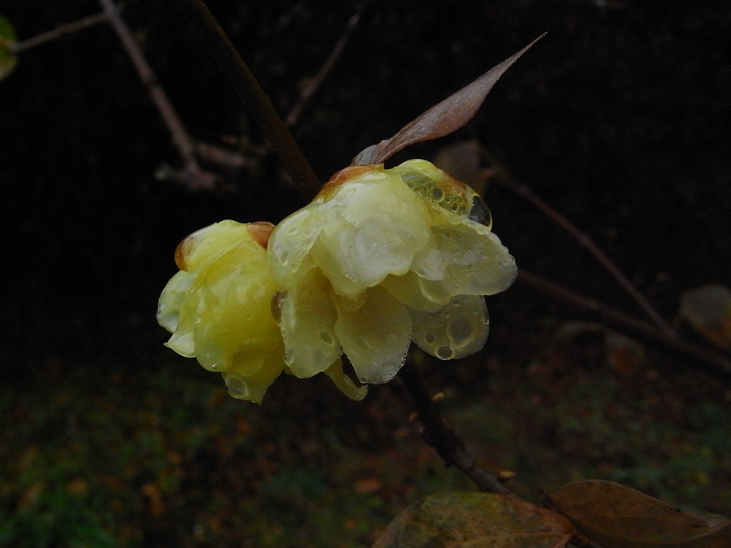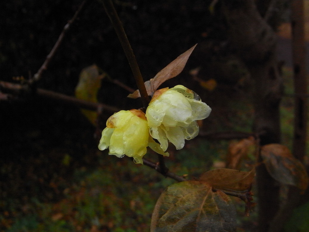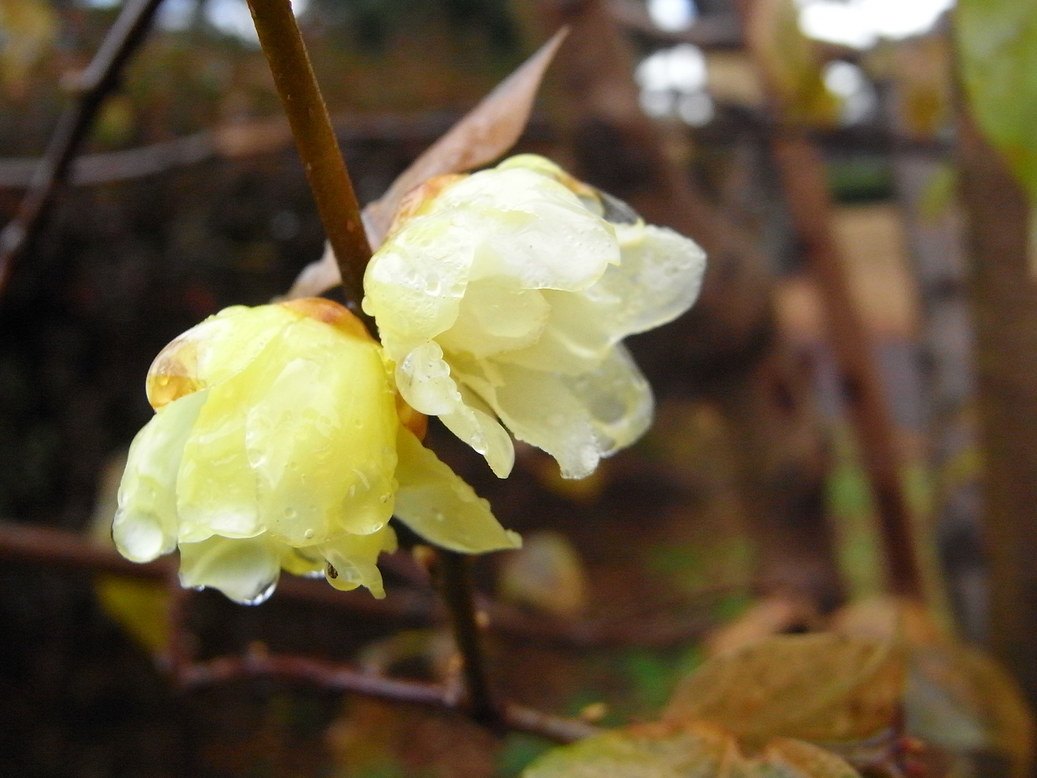 ロウバイの謂れは、花色と花弁の質感が蝋のようであるため、また老木になると蝋が垂れたような幹肌になるから。黄色の花が蜜蝋に似ていて、それが小枝いっぱいに咲く風情が梅を連想させるからとも言われています。