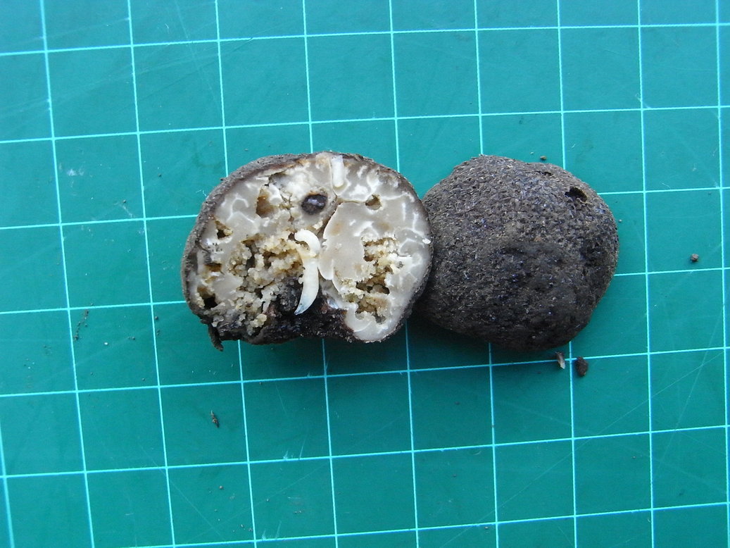 今回の写真はトリュフで左側の断面の真ん中にトリュフハエの幼虫がいます。昔はトリュフハエが止まった下を探してトリュフを探したそうです(フランス)。