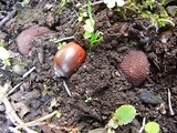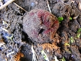 このトリュフも、昨日の所から20m離れたシラカシ林の下に発生していました。上段と下段は色が違いますが同じものです。上段のように、トリュフの菌糸が赤系なので赤みがでます。下段は乾燥して菌糸がなくなり、本来の色になります。右側はいずれもトリュフの裏面(下側)です。写真のように裏面に窪みがあるのが特徴です。