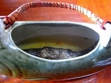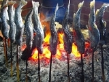 大内宿は寒いので暖かい蕎麦を食べてました。隣席に座った人の岩魚の骨酒を写させてもらいました。岩魚を囲炉裏で焼き、器の中に入れ日本酒の熱燗をその器に注いで約5〜6分でエキスが抽出して飲めるようになりました。その骨酒は薄いクリーム色になります。最後は岩魚が柔らかくなっていますのでお酒とよく混ぜて一緒に食べます。私は車の運転なので飲めずに残念でたまりせん。