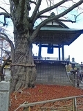 別所温泉、北向(きたむき)観音の鐘楼横に立つ桂(右上)。
