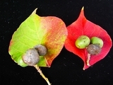 ナンキンハゼ(南京黄櫨)は、中国原産の庭園樹木で、秋の紅葉が美しいことや、白い「実」が見た目おもしろいので、街路樹として使われています。樹皮は灰褐色、葉は互生(左下)し、ひし形状卵形で先は急にとがる。枝先や葉液に総状花序をだし、芳香のある黄花をつけます。雌花は基部に2-3個の実をつけます。その実は白いロウ質に包まれ種子からロウをとります。その実は有毒。上の段の写真は左から順番に紅葉してきます。