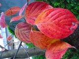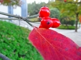 ハナミズキはミズキ科の落葉小高木。樹皮は灰黒色で、葉は楕円形となっています。北アメリカ原産。花期は4月下旬から5月上旬で白や薄いピンクの花をつけます。秋につける実は写真のように複合果で赤い。庭木のほか街路樹として利用されています。ハナミズキの別名をアメリカハナミズキと言う人がいますが、誤りです。「アメリカ山法師」が正式名称です。日本在来種のヤマボウシ(山法師)と似ているので区別するためだと思います。ハナミズキは1912年当時の東京市の市長が「アメリカへ日本の桜を贈った返礼として贈られたもの」です。 このことから、ハナミズキは「平和」と「友好」の象徴であることが分かります。ハナミズキの花言葉は「私の想いを受けとってください」ということで、歌にも詠まれています。あっちこっち目にする街路樹も綺麗な紅葉です。