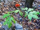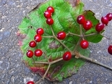 マムシグサはサトイモ科(ミズバショウやザゼンソウの仲間)テンナンショウ属の多年草。明るい森林や谷沿いのやや湿った場所に生育します。春に地下の球根から茎を伸ばし、左の写真のように多数の小葉に分かれていますが、茎の左右で2枚の複葉となり、仏炎苞を形成し、その中に花序があります。花の苞は緑色のものから褐紫色を帯びるものまであり、変異が大きい。写真のように果実は