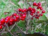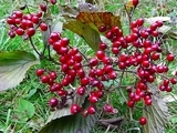 ガマズミは日本全国に分布する落葉低木。萌芽再生力が高く、葉は、長円形、対生して若葉には毛があり、葉脈は明瞭です。花は、初夏、枝に白い小花を水平につけ、芳香があります。果実は、写真のように秋に直径5ミリくらいの卵形の赤い実になり、熟すと鮮やかな赤から紅紫色になっていきます。ガマズミの実は、食べると甘酸っぱい味がします。