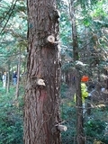 主催環境ネットで、場所鎌北湖(昨日の鎌北湖の紅葉)、指導者は県森林公社。ヒノキの枝打ちに初めて参加しました。枝打ちは、「無節(むふし)」の良質材の生産を主目的として、枯れ枝やある高さまでの生き枝を、その付け根付近から除去する作業です。枝打ちの第一の目的は、無節の材の生産ですが、それと同時に年輪幅、年輪の走向角度(材の太さを同じにする)など年輪構成の優れた材の生産にも効果があります。