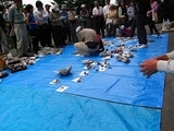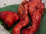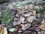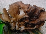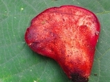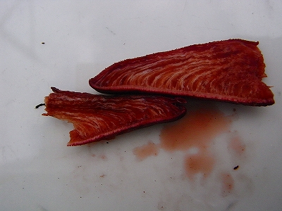 傘が肝臓―牛の舌状、表面は(一番上の写真)赤紅色―暗赤褐色で表面に顆粒をおびるのでカンゾウタケ(肝臓茸)と言います。地方名は「肝臓茸」・「牛の舌茸」、 英名はBeefsteak Fungusと言われています。 肉は赤と白の縞模様を表(二番目)し、赤い汁を含んだ獣肉様(三番目)で酸味があります。まさにキノコのビフテキです。 関東ではG.W.頃を中心に、公園や神社のスダジイの木にわりと普通に見られるようです。 今回はなんと10月、奥合津のミズナラに発生していました。図鑑によると英国ではナラの大木の根際に発生し、心材の褐色ぐされを起すと書いてありました。 フランスでは牛の舌と呼んで生のままスライスしてサラダの材料にするそうです。生で食べるのは抵抗があるので湯がいて油で炒めて食べました(一番下)。レバーを焼いた肉のような感じでした。 その名の通り、肝臓をスライスようなもの(三番目)を出されても、きっとキノコとは思わないでしょう。常識的なキノコの概念からかけ離れており、一度見るとけして忘れがたいキノコになります。 分類はカンゾウタケ科カンゾウタケ属、1属で従来はヒダナシタケ 目でしたが遺伝解析の結果、むしろハラタケも目に近縁にであると言われています。 今回は金山町(会津藩の金山のあったところ)の友人のMさんの別荘に泊まりました。