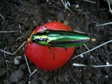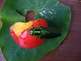 散歩していたらタマムシをゲットしました。 タマムシは本州、四国、九州、琉球などに分布し、エノキ、ケヤキ、サクラ、カシ類などの枯れ木に産卵します。出現期:7月〜8月 体長:2.5〜4.1cm。タマムシ科で、カブトムシと同じ甲虫の仲間、日本にも約200種棲息しています。 法隆寺の大宝蔵殿に、高さ224cmの玉虫厨子と呼ばれる厨子があlります。 飛鳥時代の厨子だそうだが、檜造りで、外面は黒漆塗り。縁に貼った透彫の金具の下にタマムシ(ヤマトタマムシ)の羽を敷いてあることから、この名がある。その数約2600匹だそうである。この玉虫厨子の復元が、日本麟翅学会の人々を中心にして昭和35年に行われた(日本麟翅学会より)。 厨子(ずし)とは、仏像・仏舎利・教典・位牌などを中に安置する仏具の一種。玉虫厨子や正倉院の厨子が有名。近年、小型の仏壇として見直されています。 光の干渉によって起こる金緑から金紫の色調変化します。これはタマムシ自身の天敵に対する防衛本能だと推測されます。 玉虫色(たまむしいろ)とは特定の色彩名を当てられないことから、どちらつかずの状態のことを慣用句的に「玉虫色」と呼ぶことがあります プラムの上に置いたら1タマムシは時間以上いました(写真)。。