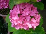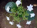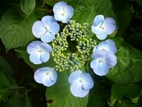 ガクアジサイは別名ハマアジサイ、ガクソウ、ガクバナとも呼ばれています。このガクは額のことで小さな花の集まりを額にたとえて、まわりに並ぶ、飾り花を額縁にみたてたものです。中央の小さな花の集まりが花で実を結びます。外側の飾り花はめしべが退化したもので、花でないので実を結びません。原産地は伊豆半島の海岸、三浦半島湘南海岸、房総半島海岸、伊豆七島などに自生します。大型で葉は厚く、光沢がある海浜性アジサイです。従って、ヤマアジサイ、エゾアジサイなどと比べると、格段に乾燥に強く、性質は丈夫で、全国どこでも栽培されます。