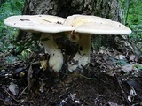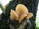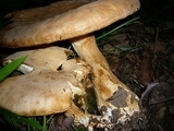 この写真はキシメジ科オオイチヨウタケ属のムレオオイチヨウタケの大型種で、私の帽子と同じおおきさ。この時期、毎年同じ場所に発生します。比企のコナラの根元。友人はさつと茹で、味噌に漬けて、2-3月後に食べたそうです?。その後のことは聞いていません。わたしは写真撮影のみ。下の左は古くなっている状態の写真です。上の真ん中はひたが蜜、柄の根元が太いのも特徴です。
