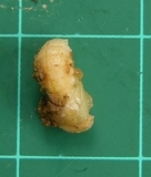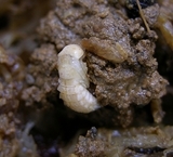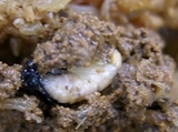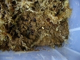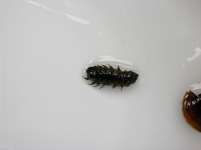 蛍の一生は卵⇒幼虫(脱皮)⇒土マユ⇒成虫(ホタル)と言われてますが、今回ホタルの里親に参加して、上陸装置に赤球土とミズゴケを使用すると土マユを造らず、ミズゴケの下で湿度を充分に保てるので「サナギ」をつくり過ごし、成虫なるような気がします(上の写真)。上の左のメモリは1cm.
