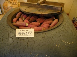 右の写真。竈焼き(カマ焼き)は米俵の藁(イネワラ)を焼き、その灰を麦、サツマイモの栽培の肥料にして、利用した江戸時代の循環型農業(地球に優しい環境)の代表の一つです。川越の平本屋のツボ焼きは「中国の農家の調理用」を利用して今も商売しています。 菓子屋横丁でも、戦後の食料難の時代はもち米が無く、サツマイモの澱粉を使って、水飴を作り、これをいも飴に仕立てたそうです。