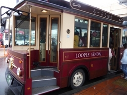 ループル仙台(右)は仙台駅前を起点に、市内のお勧め観光を約一時間で循環します。乗り降り自由で一日乗車券が600円。土井晩翠旧宅(左)と青葉城を見学しました。運転手が教育されていて、観光地の説明がすばらしいのに感心。