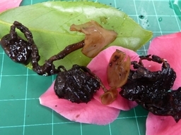 ツバキキンカクチャワンタケ(椿菌核茶碗茸)は地上に落ちた老朽委縮した花と葉に付着してキノコを生じます。菌核内部に宿主である花と葉組織の残片(左の写真の右側の部分)が認められます。キノコの傘は3-18mm(中央)、柄は長い。キノコから噴射された胞子は近くに落ちている花の上で発芽して菌糸を生じ、菌糸は花の組織を分解して成長します。秋に菌核となり再び花の咲くころにキノコを生じます。