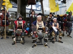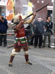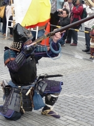 昨日の続き。場所は本川越駅前広場で、甲冑をまとった川越藩火縄銃鉄砲隊による火縄銃の空砲発射が轟音をとどろかしました。川越藩松平大和守は約2000丁の火縄銃があったという。