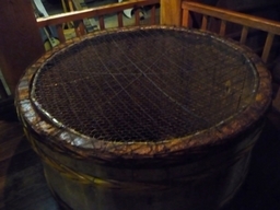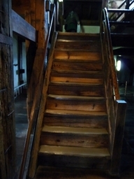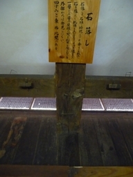 松江城内の二階等に幅広い穴が石落とし(左の写真)で石垣に近づく敵に、石を落とすようになってます。地階(穴蔵の間)には籠城用の生活物質の貯蔵庫と深さ24mの井戸(真ん中の写真)があります。左の桐の階段はいざという時に階段を引き上げる。防火用に桐を使用したという。