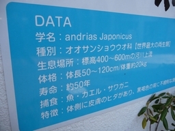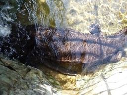 のドライブインでオオサンショウウオをみました。水中なので写真の写りが・・・。西日本に住み、両生類では世界最大のおおきさを誇ります。その発生は2億年の昔にさかのぼります。ヨーロッパでは氷河期でほとんど滅び、6千万年前の頭蓋骨が発見されたとき、人類の祖先だと騒がれたという。言い伝えによると体が半分にされても生きているというので「ハンザキ」ともいう。