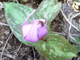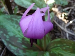 今年も庭にカタクリが咲きました。カタクリはユリ科の多年草で、別名カタカゴともいう、花が咲くのは3月から。花は紫色のまだらの入った2枚の葉の間に一輪だけ咲き、6枚の淡い紫色の花びらの付け根付近にはWに見える濃い紫色の模様があります。