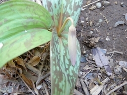 カタクリという名前は漢字で「片栗」と書きますが、ジャガイモに取って代わられるまで片栗粉を作る植物として利用されてきました。その片栗粉の原料になったのは細く長く伸びた根の先に付いたユリ根に似た鱗茎(りんけい)と呼ばれる部分です。旧鱗茎の下に新鱗茎をつくられる。そのため、開花株では鱗茎が土中深くもぐります。