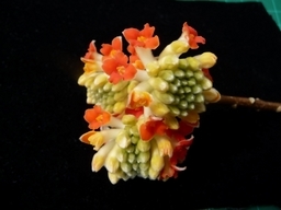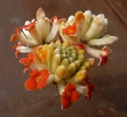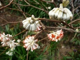 このミツマタは京都の友人から枝をもらって挿し木で繁殖させたもの。ミツマタ(三椏・三叉)はジンチョウゲ科ミツマタ属で香りもさわやかです。真中の写真のように枝が3つにわかれているので三叉といわれてます。ガクは筒型で先は4裂し、外側に白し毛が密生。写真はアカバナミツマタで園芸種です。
