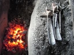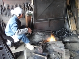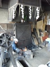 真ん中の写真は、フイゴ(鞴)。 金属の製錬・精錬・鋳造などで、炉の火力を高めるために用いる送風道具。 取っ手を前後させ、風を送る。 かつては、野鍛冶が村々にあり、耕作者の好みを聞きながら刃先の角度や大きさを調整していたそうです。最近、道具にこだわる大工さんが増えて、訪ねて注文してくれるのがうれしい。