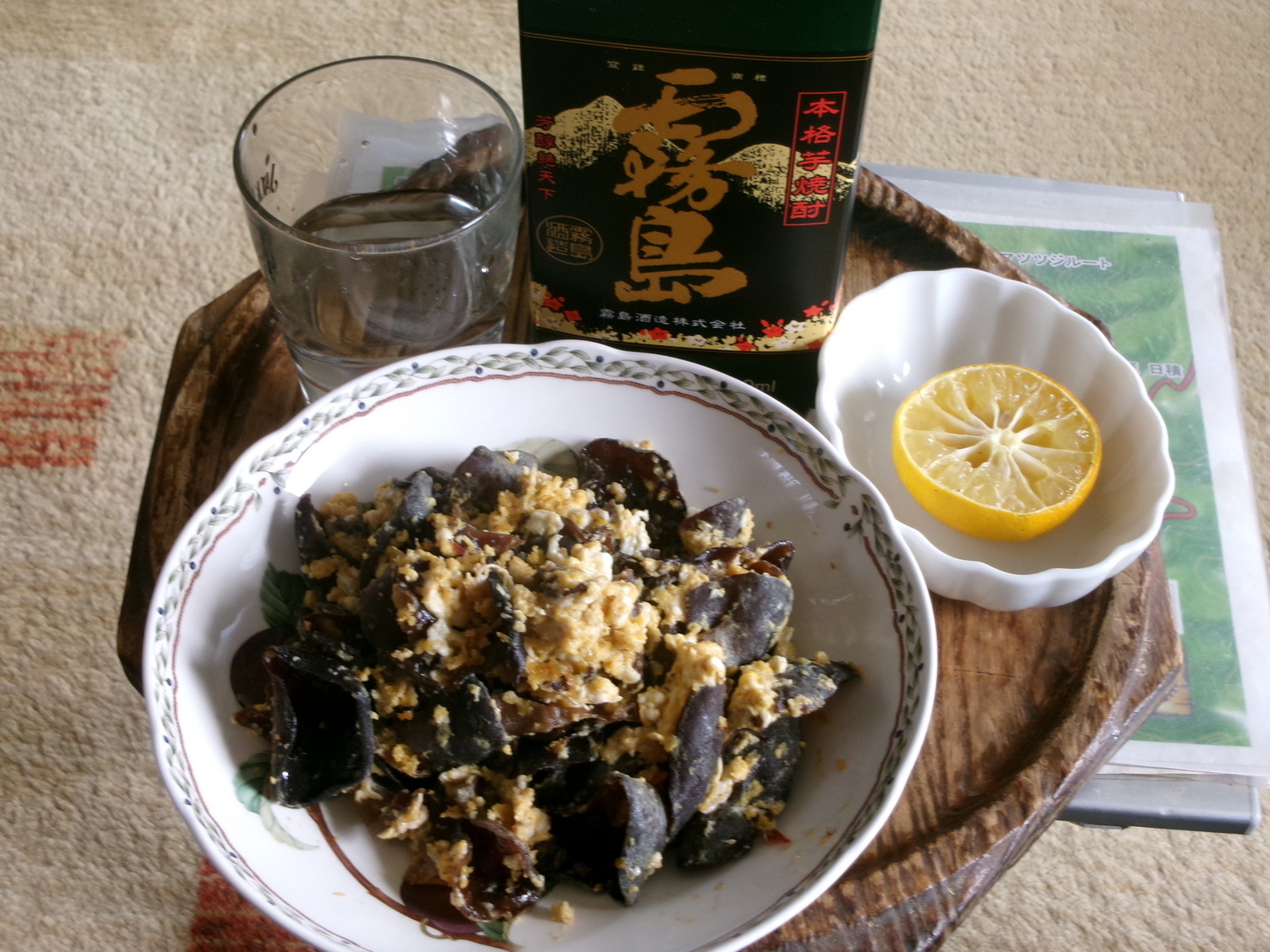 春に茶臼山で採って来た木耳(きくらげ)の卵とじを作って昼飲みです。昼食を作るのが面倒なので、これが今日の昼食兼昼酌です。