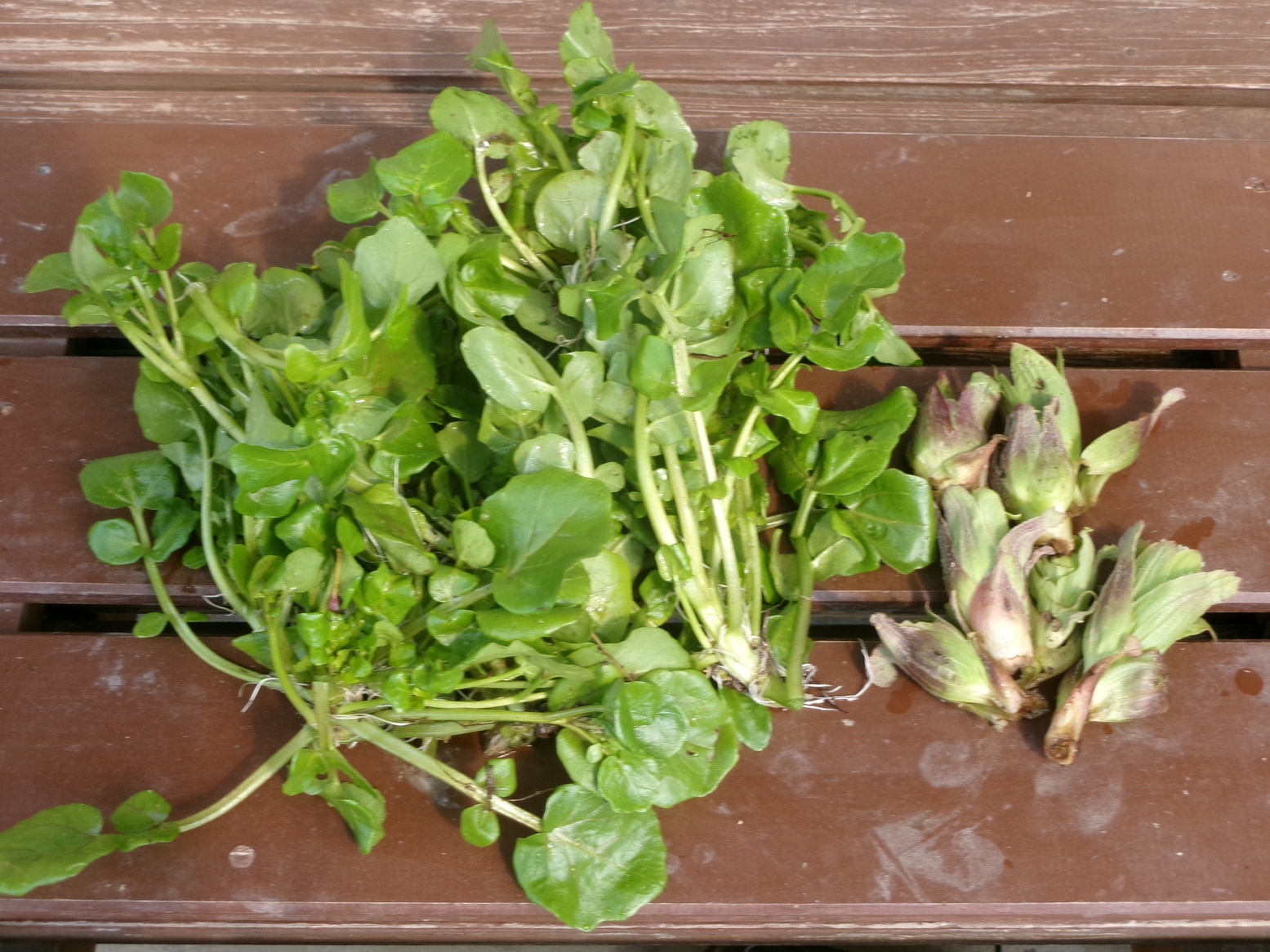今朝の茶臼山トレッキングの途中で採って来た平茸と、畑で採って来た蕗の薹を一緒にバターとオリーブオイル、塩・胡椒で炒めました。 飼い主さんの提言で、そんなのは合うのかと疑念を抱いていたのですが、食べてみたらけっこう行けました。料理にも先入観はよくないようです。 なお添えてあるのは今朝小川で採って来たクレソンです。