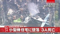 住宅街に軽飛行機墜落 軽飛行機の2人と墜落現場の女性1人死亡。 調布市の住宅街に、26日午前11時ごろ、軽飛行機が墜落した。住宅3棟と車2台が燃えているほか、これまでに、軽飛行機に乗っていた男性2人と、住宅にいたとみられる女性1人の死亡が確認された。さらに、逃げ遅れた人がいるとの情報がある。
