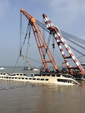 長江転覆船、クレーンでつり上げ180度転回 長江で456人を乗せた大型客船「東方之星」が転覆した事故で、死亡が確認された人は56日までに計103人に増えた。 安否不明者は336人。 中国当局は5日朝、クレーン船で船体をつり上げる作業を開始し、ひっくり返っていた船体を180度転回させた。中国中央テレビによると、500トン級のクレーン船2隻によるつり上げ作業は順調に進んだ。今後、船体をできるだけ水面上につり上げ、安定させた上で、ダイバーらが船内に入るなどして不明者の捜索を急ぐ。遺体の身元確認のため、家族らのDNA採取を始めている。