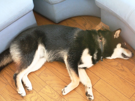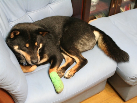 今日もキャンプオフのレポをしようと思ったのですが。 実は、銀牙は初日の散歩の後くらいから、向かって右側前脚をピョコピョコとしていたのを気に掛けて関節や外傷をチェックしていたのですが原因解らずで、 しかも、元気に走り出す事も有ったので忘れかけていました。 帰宅後にやっぱりビッコの前脚・・・ 以前、雲母が栗のイガイガが前脚に刺さって同じ様な仕草をしていた事を思い出して、銀牙の脚を再度見てみたら なんと1つのニクキュウが割れていました(;´д` ) 疲れもあってか帰宅直後はグッタリしていたので、そのまま様子を見て居ましたが 心配で月曜の朝一番で動物病院へ 原因はハッキリしませんが、銀牙のニクキュウは比較的まだ柔らかい方で、尖った石などでも、当り方によっては割れる事もあるそうです。 幸いに化膿止め止めの軟膏を塗ってテーピング。 化膿止めの薬を10日分頂き、今週末に再診の予定です。 でも、若く回復力が良いのか、今はそれほど痛そうな素振りも見せず。お散歩も普通に行ける様に成って来ています。 心配だった体重も2ヵ月前に対して-100gとの事で一安心です。