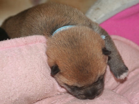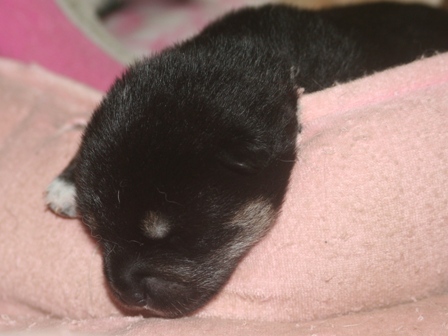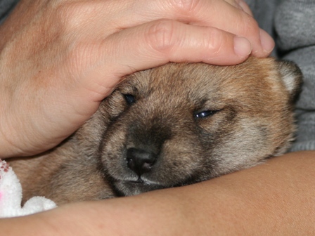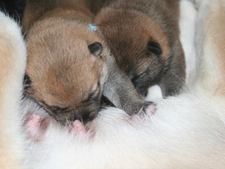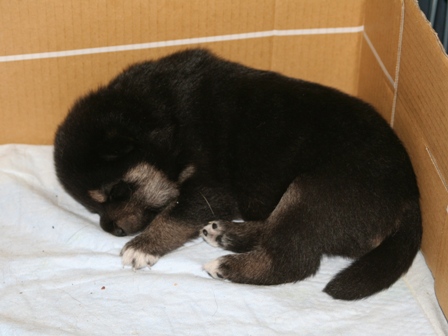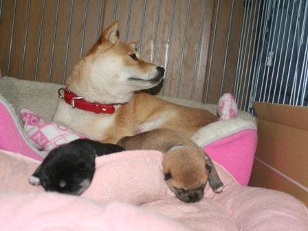 ワン仔達かすかですが、みんな薄っすらと瞼が開いている様です。運動量は黒♂で声が元気なのが赤柴♀(次女)胡麻♀の長女は、寝ている時に兄妹どちらかを枕代わりにして寝ています(笑)