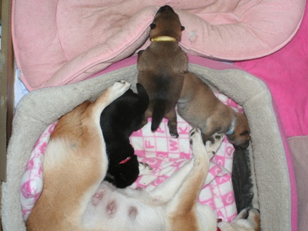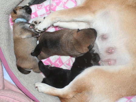 オッパイが足りない様だったら、市販されている物を試してみても良いと考えます。ただ、最初は難航するでしょう。それも2〜3週間位の事です。元気な小ワン仔達が離乳食へ切り替わる次期には排泄の処理にてんやわんやでしょう(笑)